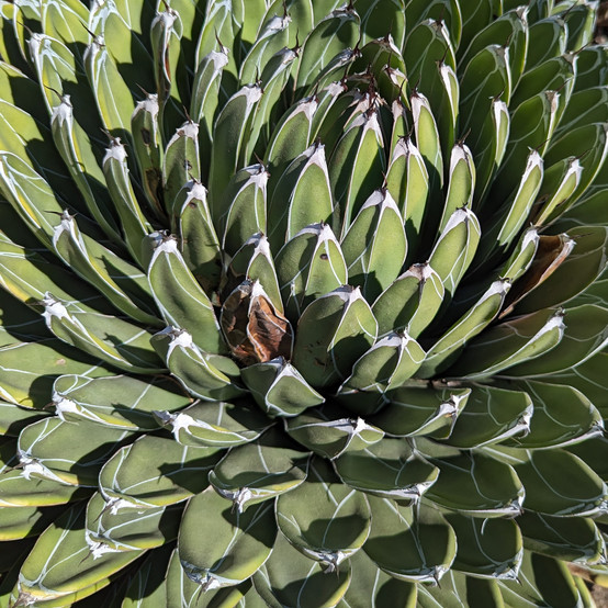 Meandering the sinuous, rock-lined pathways became a discovery around every curve. I could not help but feel the effect was by design, to offer contemplation of each specimen. Sculptural, twisty cacti rose into the sky while barrels sat idle basking in the sun. But what could not be missed were the two yucca trees mirroring each other toward the center of the garden. Standing as large as oak trees, they appear much sturdier than the Yucca brevifolia I have seen, although to be clear, only a few have crossed my path over the years. A rough map of the garden, available on Stanford’s website, identifies the broadly arching specimen as Mojave yucca, or Yucca schidigera, while the other more stately, symmetrical example is simply labeled as “Tree Yucca." For its part, a quick review of Y. schidigera notes a height no more than sixteen feet on Calscape’s website, so this information may need to be reviewed.